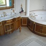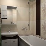 Often, tiles of several colors are installed in the bathroom, separated by a line of tiles of other sizes and styles. Dark brown elements are laid up to the middle of the wall. For the dividing line, you can use elongated beige elements with brown ornaments. The wall is covered with beige material from the middle to the ceiling. A combination of samples of other colors is possible. Both in the photo and in life, this design looks neat.