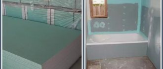 When choosing plasterboard for finishing work in wet rooms, you should pay attention to the color of the sheets. A material with an outer layer of green (sometimes blue) cardboard is required. Only this type can withstand dampness and not collapse. This is a durable material with good heat and sound insulation characteristics. From it you can build not only a screen for the bath, but also sew up communications with a box that are otherwise impossible to hide. Using metal profiles and moisture-resistant drywall, vertical and horizontal boxes are mounted.