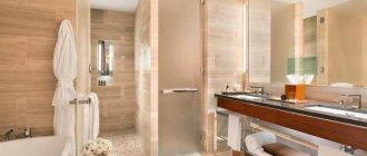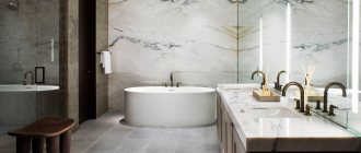 Напольное покрытие и стены – керамогранит Panaria. Мебель «Мастерская-13», сантехника Laufen, освещение бра Eichholtz. Душевая перегородка Vegas.